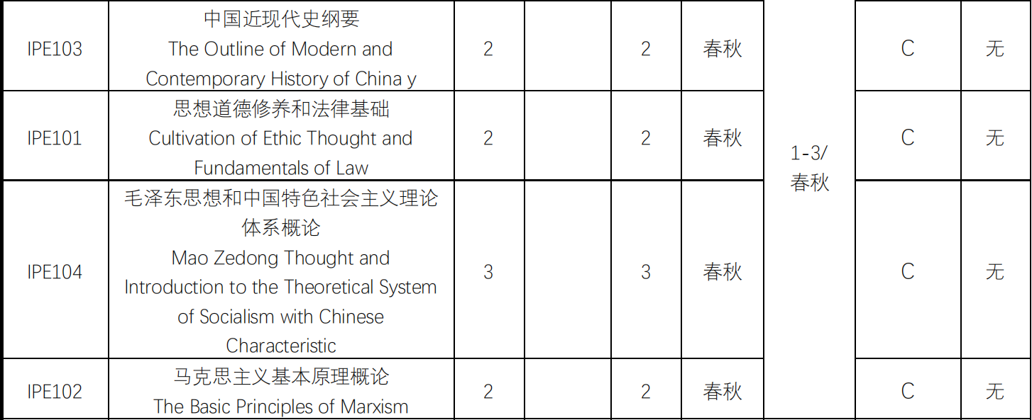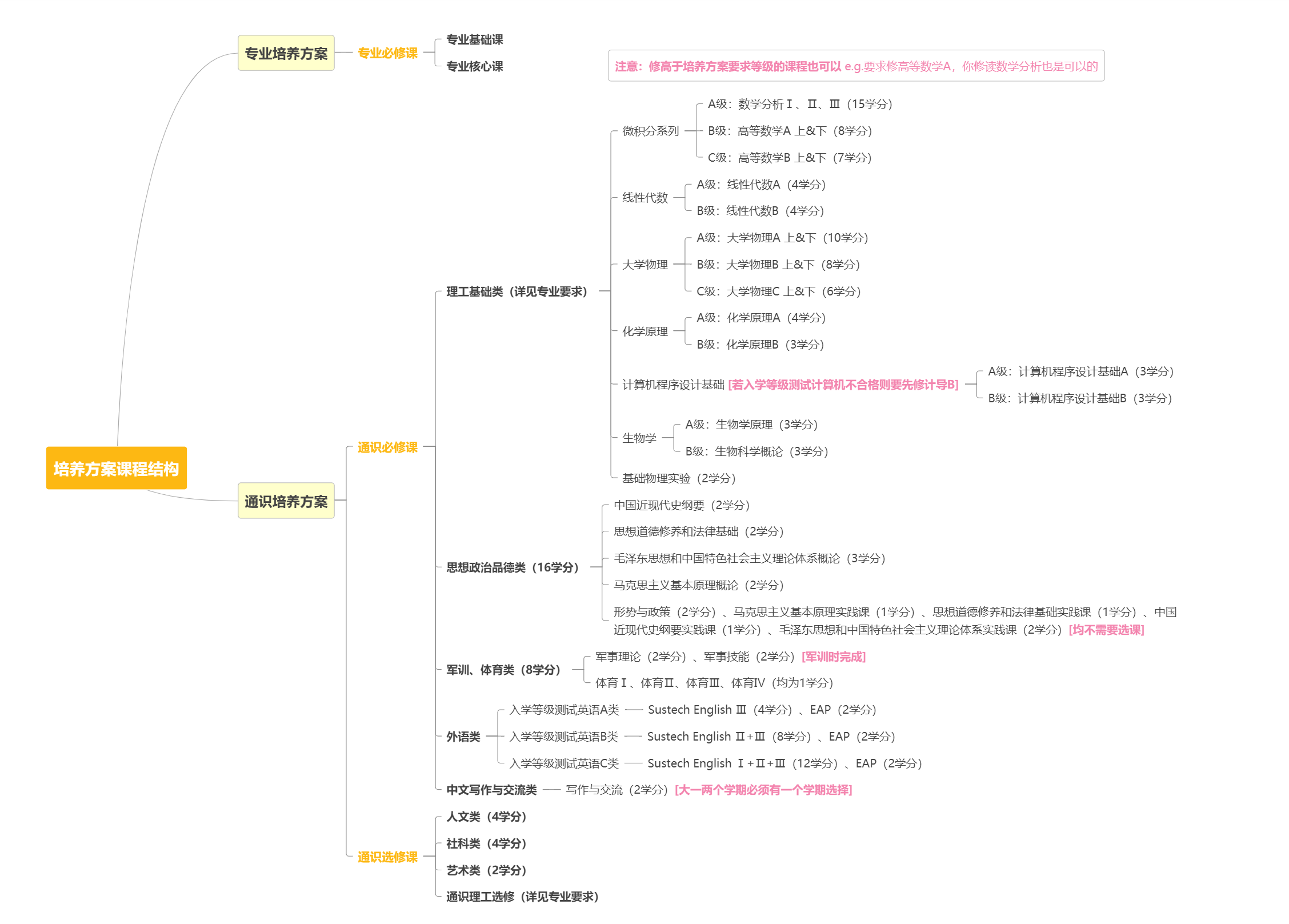 图:课程结构总结(参考2020级培养方案)通识课程。 体育课大家都必须选体育 I,英语要根据大家入学等级测评的结果来选择,思政课在下面四个任选一个(在四年里修完这四门就行,如果学分不够了可以放弃一学期,体育和英语也是同理)