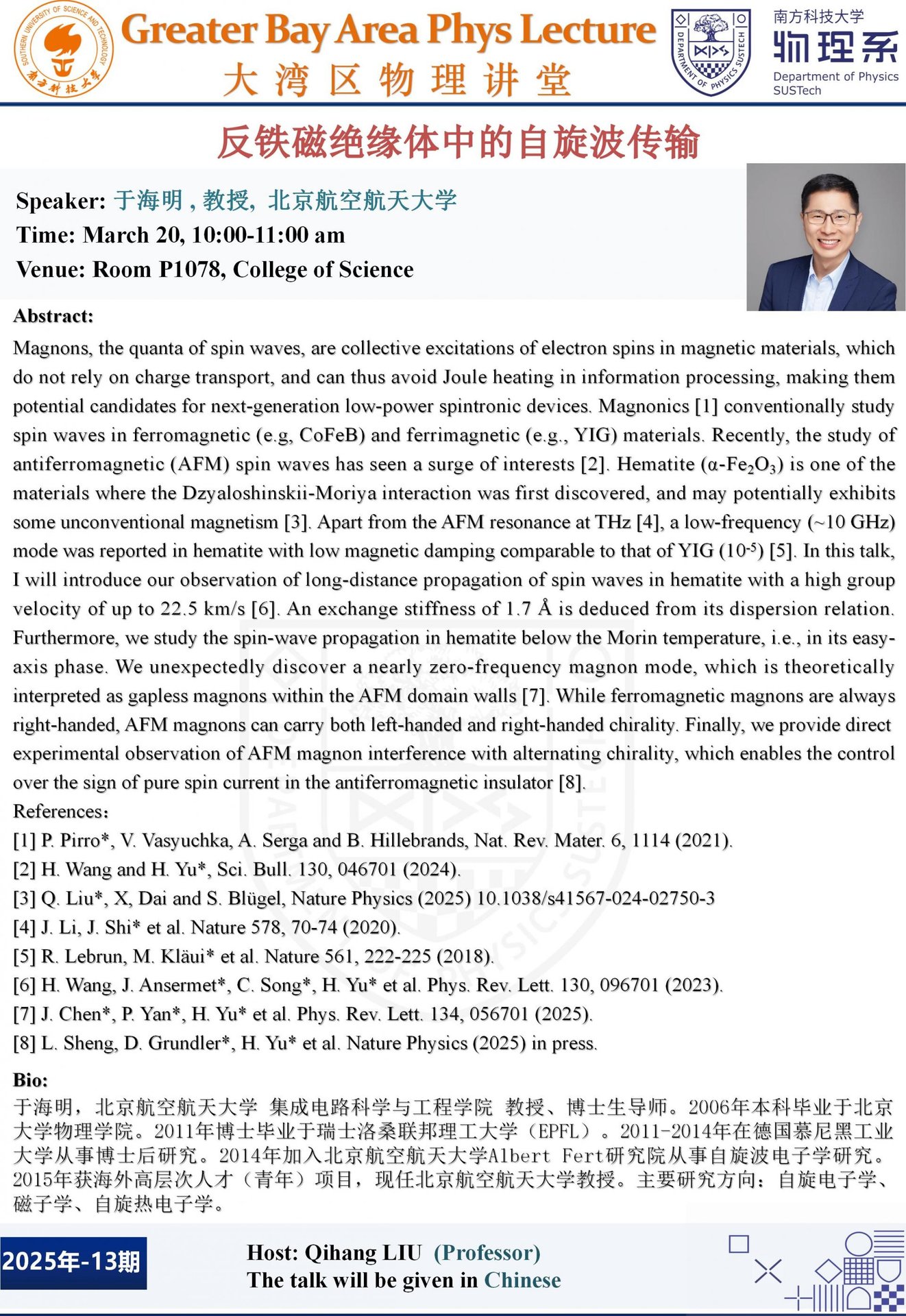 《大湾区物理讲堂 2025-13期》于海明:反铁磁绝缘体中的自旋波传输